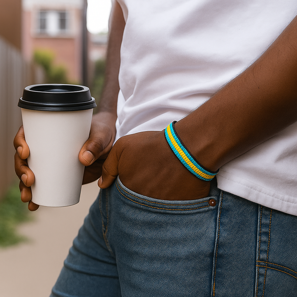 Show your pride for Bahamas with this stylish and adjustable boho-style rope bracelet. Crafted with durable string or thread, this bracelet features the iconic colors of the Bahamas flag, making it a perfect accessory for both women and men. Its adjustable design ensures a comfortable fit on any wrist size. Whether you're celebrating your heritage or simply appreciating the beauty of the Bahamas flag, this bracelet is a versatile and fashionable way to express your love for the country. Wear it alone or stack it with other bracelets for a trendy, layered look. With its vibrant colors and bohemian flair, this bracelet is sure to become a staple in your jewelry collection. Some images are digitally generated for display purposes. Actual product may vary slightly as each bracelet is handmade.